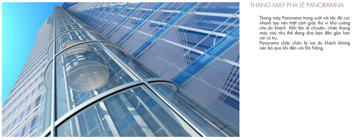 Được trang bị 2 thang máy Panorama chạy xuyên suốt các tầng tạo điểm nhấn ấn tượng độc đáo. Tòa tháp với 80% các căn hộ đều hướng ra biển, là condotel duy nhất sở hữu tầm nhìn thoáng rộng bao quát thành phố Đà Nẵng và biển mà không bị vướng bất cứ tòa nhà nào khác.